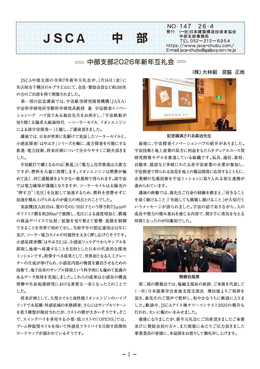 1.中部支部2026年新年互礼会2.一般解としてのHPシェル ~厚木ニケクリニック多目的ホール~3.杭工事における支持層到達確認の判断手法説明会の開催4.全国鐵構工業協会青年部会(全青会)中部ブロック 意見交換会5.JSCA中部計画部会U35構造設計座談会6.「プレストレストコンクリート構造の設計」勉強会報告